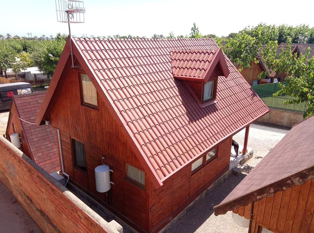 Trabajo diseñado y realizado. Cubierta de panel Sandwich con toque rústico interior y clásico exterior. #cubierta #tarragona #tarragonacomerç #ConstrucciónMetálica #panelsandwichButton